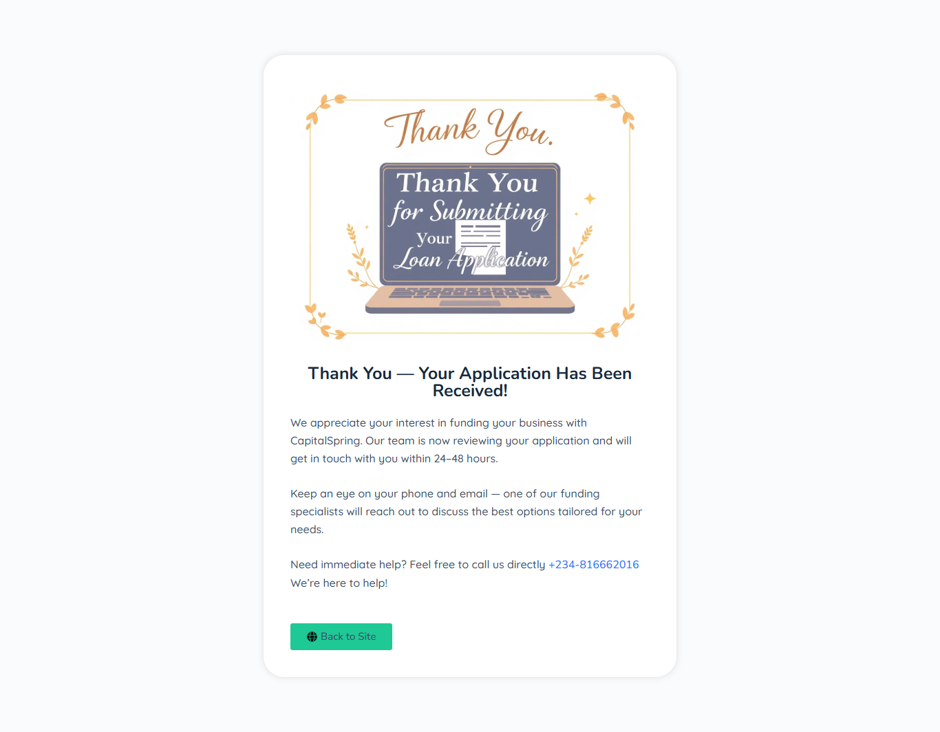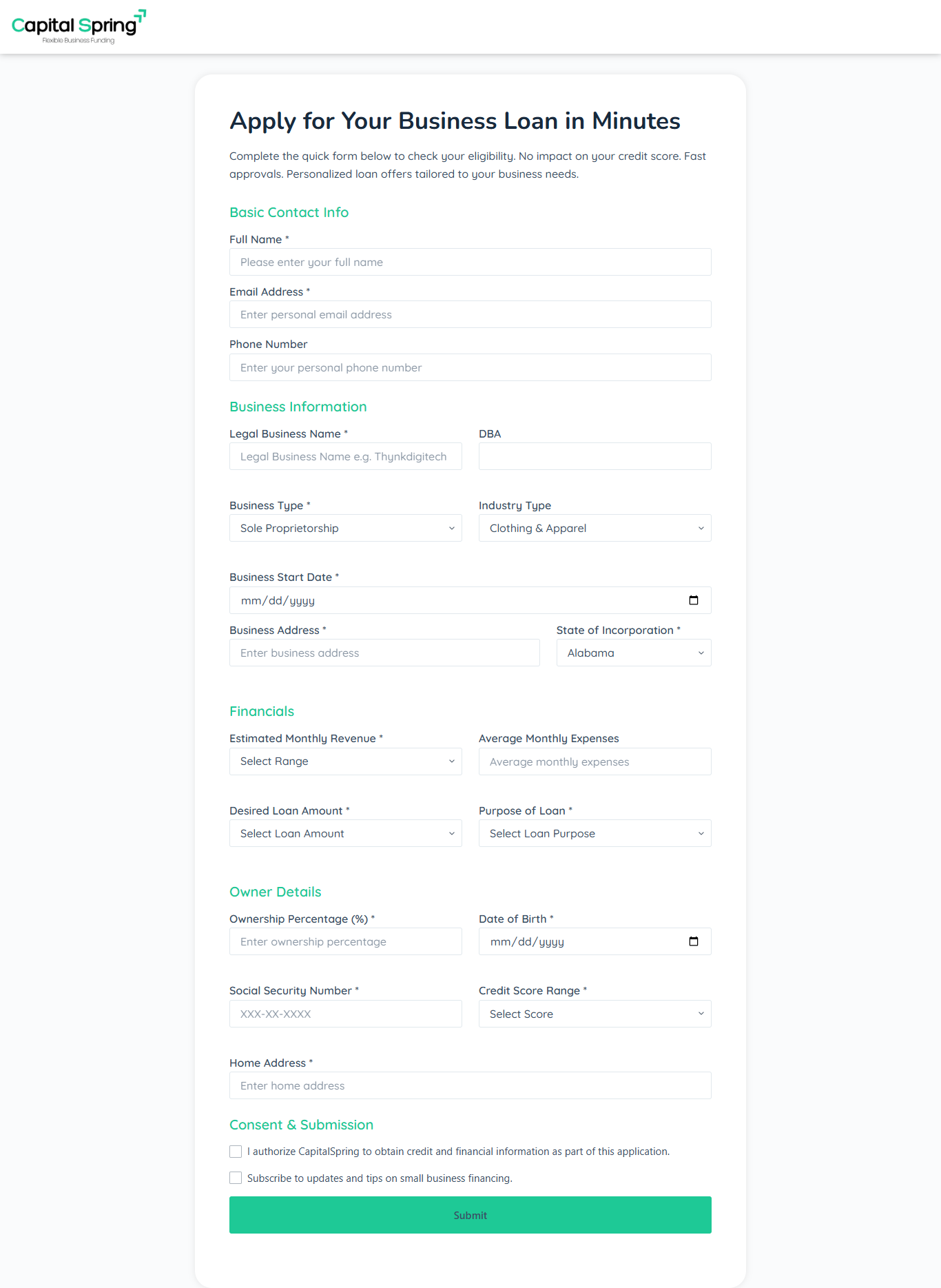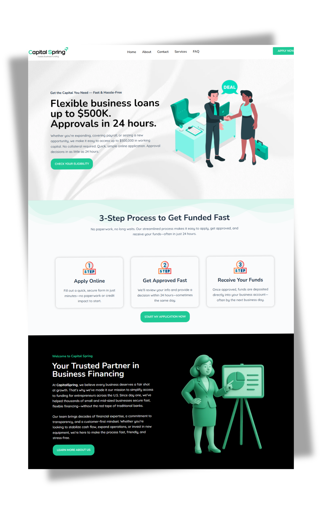 CapitalSpring is a high-converting business loan landing page built entirely with WordPress, using Elementor and JetFormBuilder — no coding required.
